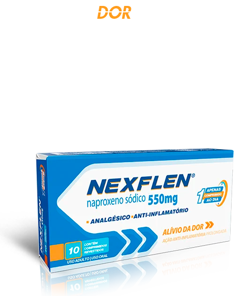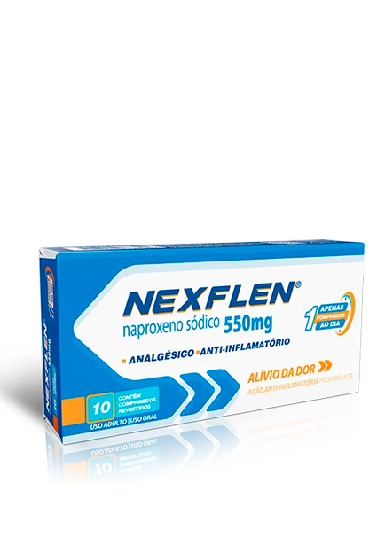 Nexflen® é um anti-inflamatório (reduz a inflamação) com ação analgésica (alivia a dor) e antitérmica (reduz a febre) à base de Naproxeno Sódico 550 mg (equivalente a 500 mg de naproxeno). Age rapidamente, iniciando sua ação 20 minutos após a ingestão do medicamento.